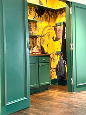 This client wanted an overhaul to their small outdated powder room and coat closet. The goal was to build a larger bathroom and pantry space. We built custom door panels to hide both spaces when not in use. Bold colors embrace you when you open both spaces. The pantry doubles as an entertaining space.